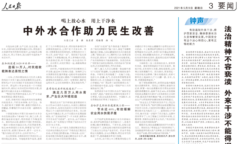 5月9日,人民日報第三版頭條刊登了題為《中外水合作助力民生改善》的新聞報道,文中講述了近年來中國與相關國家加強水合作,幫助其進行水資源開發利用和管理保護,讓當地民眾喝上放心水、用上干凈水,助力提升當地的生產生活水平。其中,由中國電建承建的哥倫比亞緹比托克水廠相關報道體現了中國電建在構筑生命之源、生產之要、生態之基工作上的不懈努力。